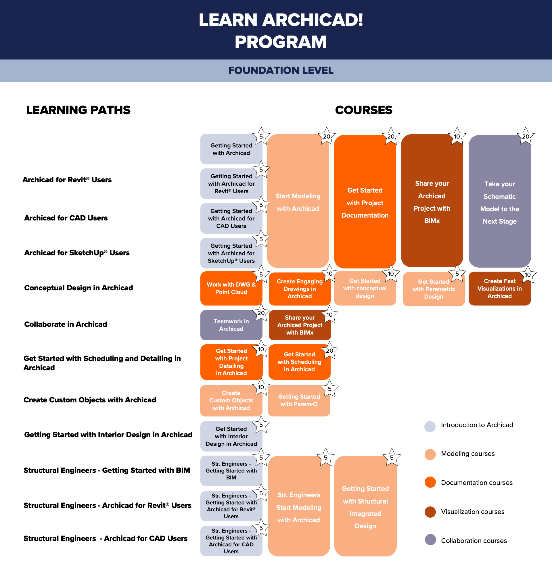 There are 2 levels of courses included in the Learn Archicad! Program. The foundation courses provide a strong fundamental understanding of Archicad and other Graphisoft products, earning you points towards becoming a Certified Archicad BIM User. Meanwhile, the advanced courses further enhance your knowledge and skills, guiding you towards the coveted title of Certified Archicad BIM Author.